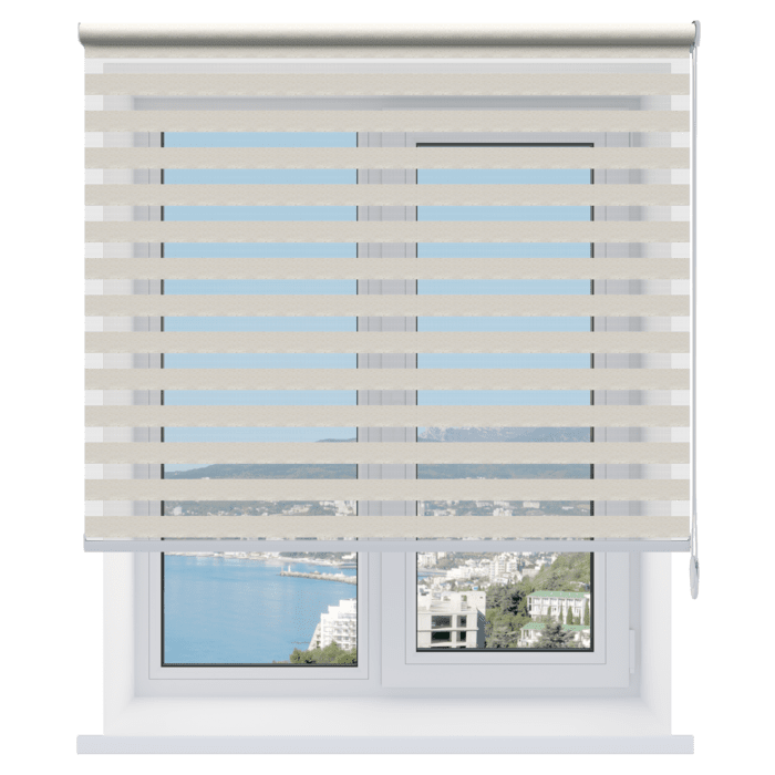 Открытые рулонные шторы «день-ночь» – солнцезащитные системы, состоящие из полотна (состоит из двух слоев ткани с прозрачными и непрозрачными полосами), которое при подъеме наматывается на вал без короба. Такие модели рольштор стоят дешевле закрытых, но ткань на валу остается открытой и не защищена от пыли.