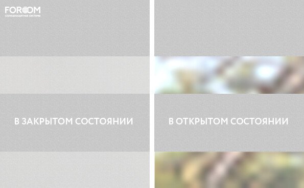 Полотно ткани, состоит из чередующихся горизонтальных полос – прозрачных и непрозрачных. Изменяя положение этих полос относительно друг другу, можно создать целых 3 режима регулировки светом. Например, чтобы в помещении стало светлее, нужно расположить прозрачные полосы друг напротив друга. Если разместить прозрачную и непрозрачную полосу параллельно друг другу, то можно добиться практически полного затемнения.