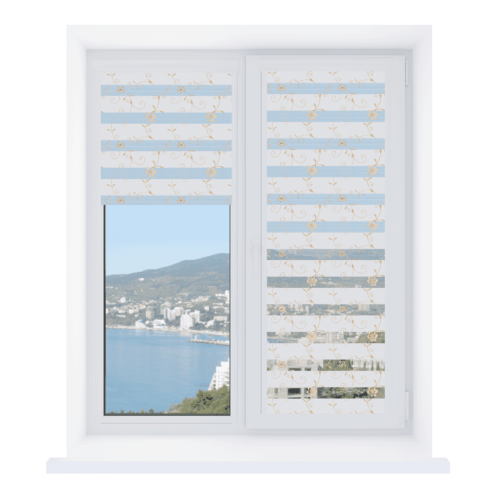 Полотно ткани, состоит из чередующихся горизонтальных полос – прозрачных и непрозрачных. Изменяя положение этих полос относительно друг другу, можно создать целых 3 режима регулировки светом. Например, чтобы в помещении стало светлее, нужно расположить прозрачные полосы друг напротив друга. Если разместить прозрачную и непрозрачную полосу параллельно друг другу, то можно добиться практически полного затемнения.